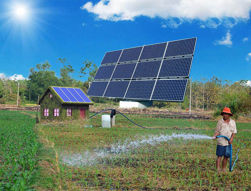 Hệ thống tấm pin sẽ nhận năng lượng bức xạ mặt trời và chuyển hóa thành điện cung cấp cho biến tầng năng lượng mặt trời để điều khiển trực tiếp máy bơm nước 1 pha hoặc 3 pha (220 V/380 V) mà không cần điện lưới. Nước được bơm trực tiếp từ sông, suối, giếng cho việc tưới tiêu hoặc có thể được dự trữ vào các bể chứa/hồ nước trên cao để sẵn sàng cho việc tưới tiêu bất kỳ thời điểm nào trong ngày.